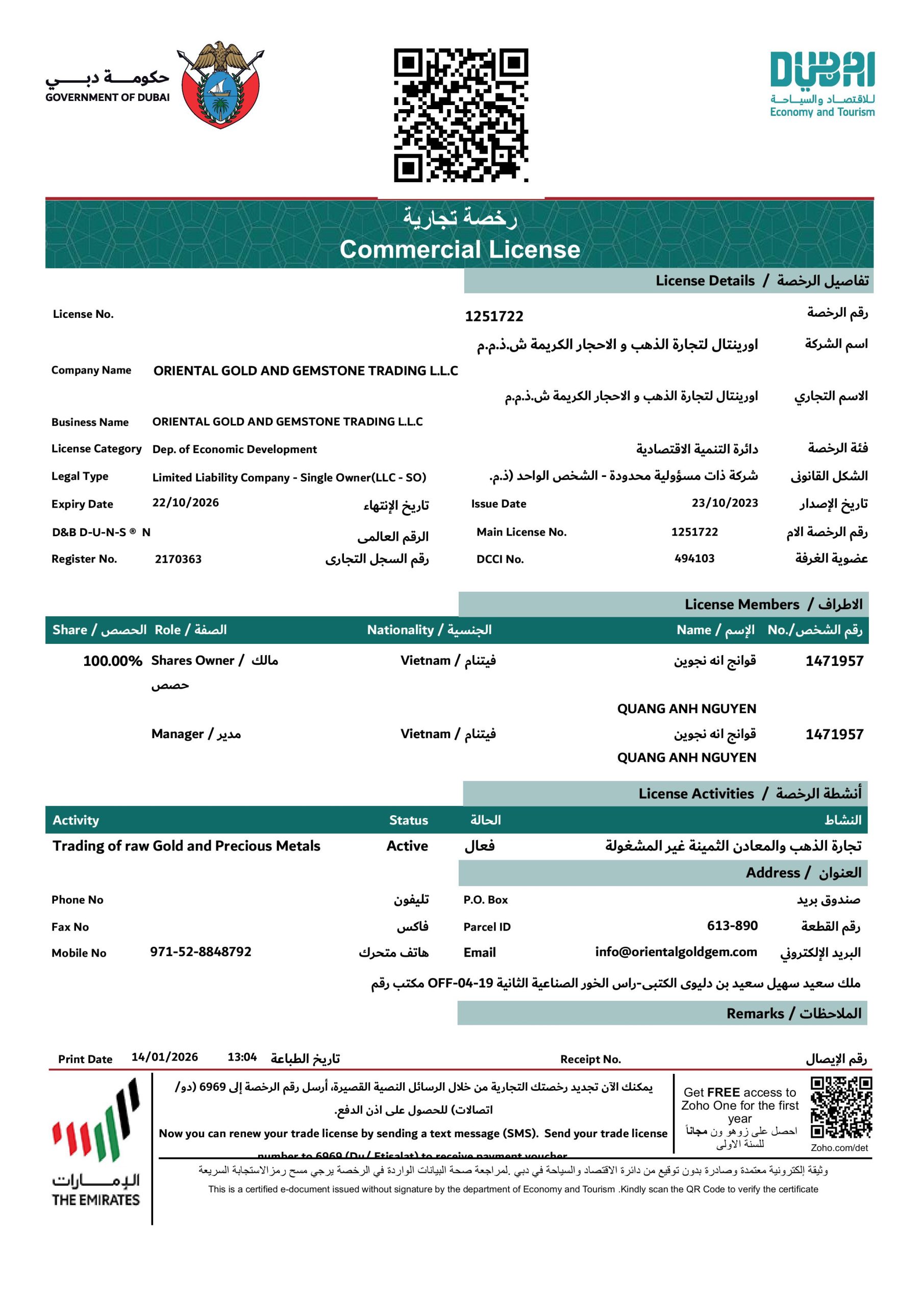 Oriental Gold & Gemstone Trading LLC is registered and approved to operate by regulatory authorities in Dubai and UAE. We comply with all corporate, tax, and legal regulations relevant to our industry.